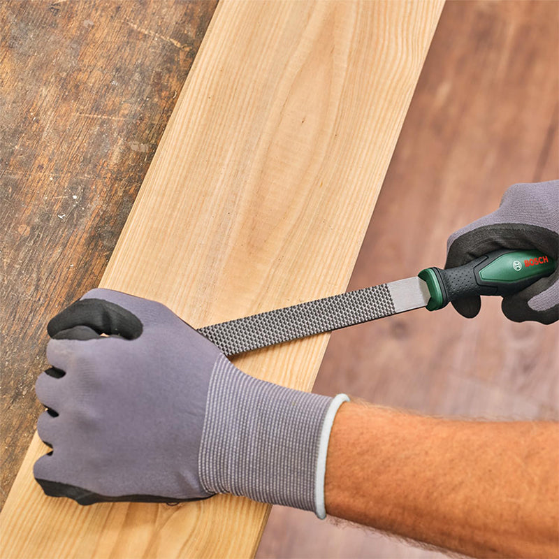 Bosch Rasp Set 200mm 3-Piece When it comes to DIY woodwork, the Bosch 3-piece rasp set, featuring 20 mm flat, round and half-rounded rasps, is the ideal choice for making furniture, repairing fixtures or restoring antique pieces. These high-quality hard carbon steel rasps have a stroke 2 cut blade with medium-grade roughness for efficient smoothing and shaping of wood. Thanks to ergonomic soft grip handles with thumb indentations, woodwork is more comfortable and controlled. For quick storage and quick access, these rasps come with convenient hanging holes. For added convenience, each rasp includes a hanging hole, allowing for easy storage and organization in your workshop or garage. Technical details: Material: Carbon Steel Hardness: 50 +/-3 HRC Stroke: 2 (Medium) Shaft length: 200mm Hanging hole: Yes Standards: ISO 234 Scope of Supply: 1x Flat wood rasp 200mm 1x Half round wood rasp 200mm 1x Round wood rasp 200mm