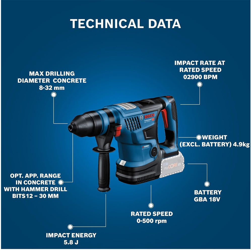 BOSCH CORDLESS ROTARY HAMMER BITURBO WITH SDS PLUS GBH 18V-34 CF 18V(WITH ONE 18V 4.0 AH BATTERY & 18V-40 CHARGER)