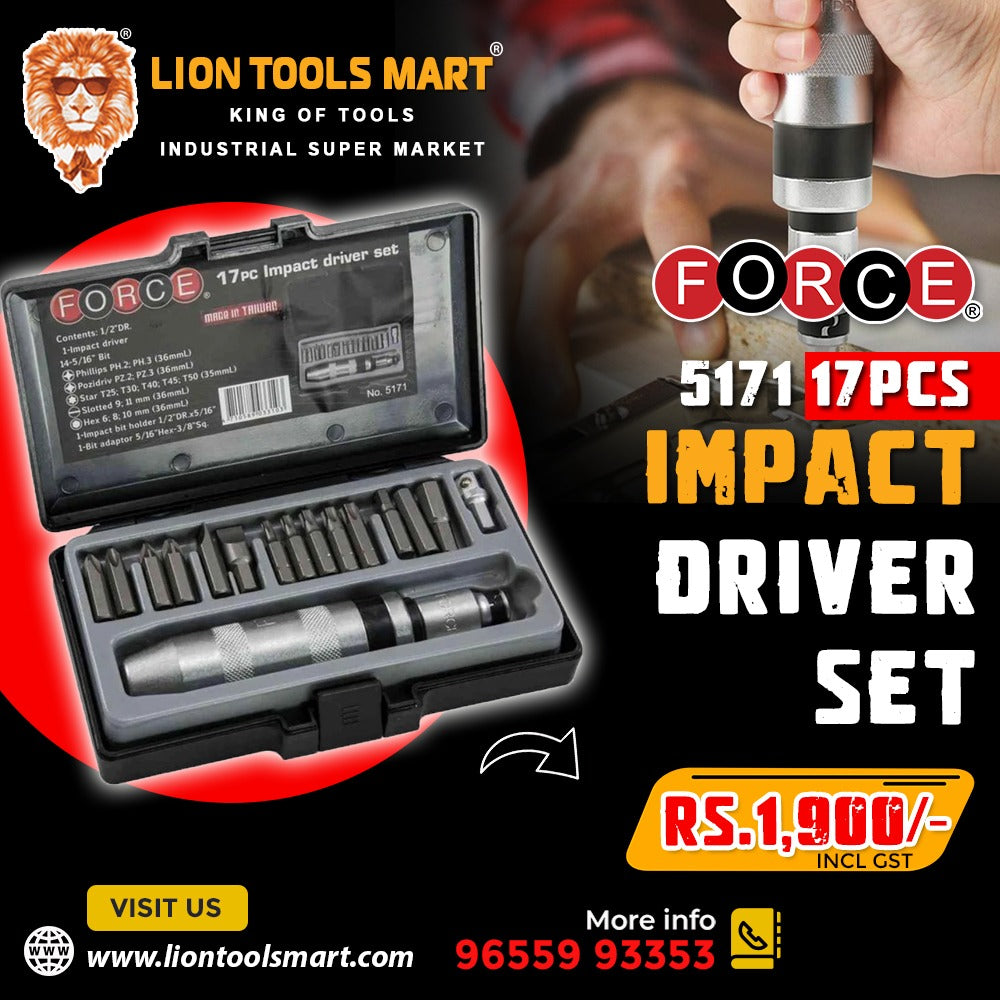 The FORCE 5171 Impact Driver Set is an essential heavy-duty tool for every mechanic and industrial professional. Specifically designed to loosen rusted, frozen, or stubborn screws and fasteners, this set delivers a powerful instant impact force that breaks through corrosion without damaging the screw head.
