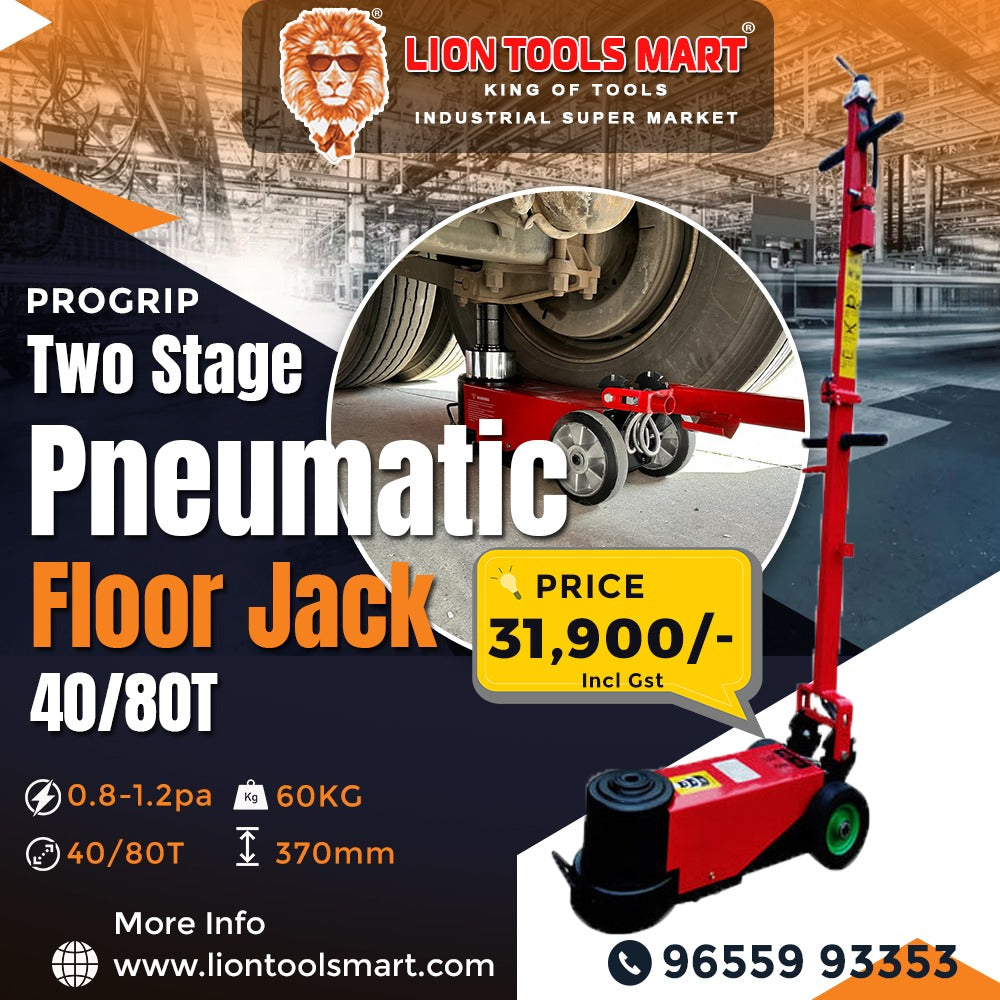 Stop wasting time and manual effort on heavy-duty vehicle maintenance. The PROGRIP Two Stage Pneumatic Floor Jack from Lion Tools Mart is engineered for the demands of the industrial super market and professional garage. This 40/80 Ton air-hydraulic beast combines rapid pneumatic action with robust hydraulic power, delivering quick, effortless, and safe lifting.