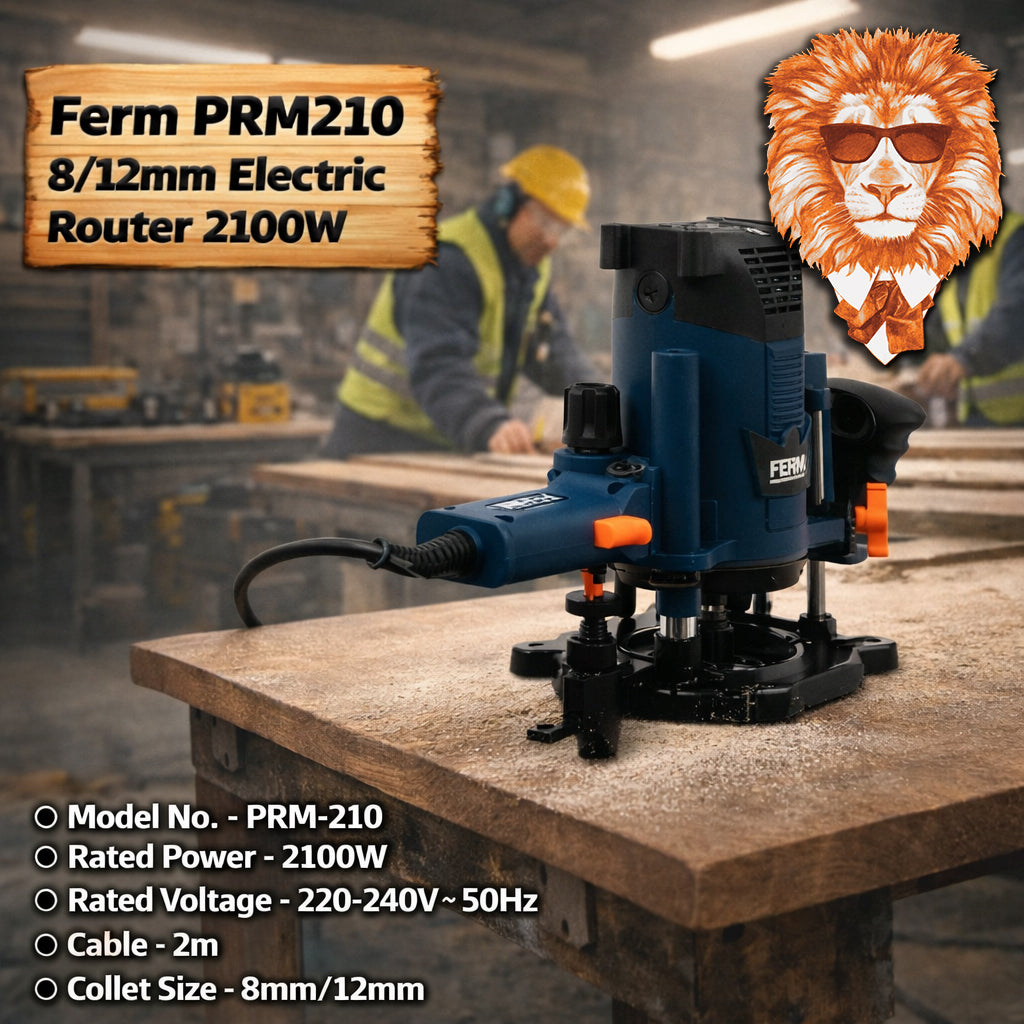 The Ferm PRM210 Professional Electric Router is a high-capacity woodworking tool designed for heavy-duty applications. With its massive 2100W motor, it is built to handle large router bits and deep cuts in dense hardwoods that smaller routers cannot manage.