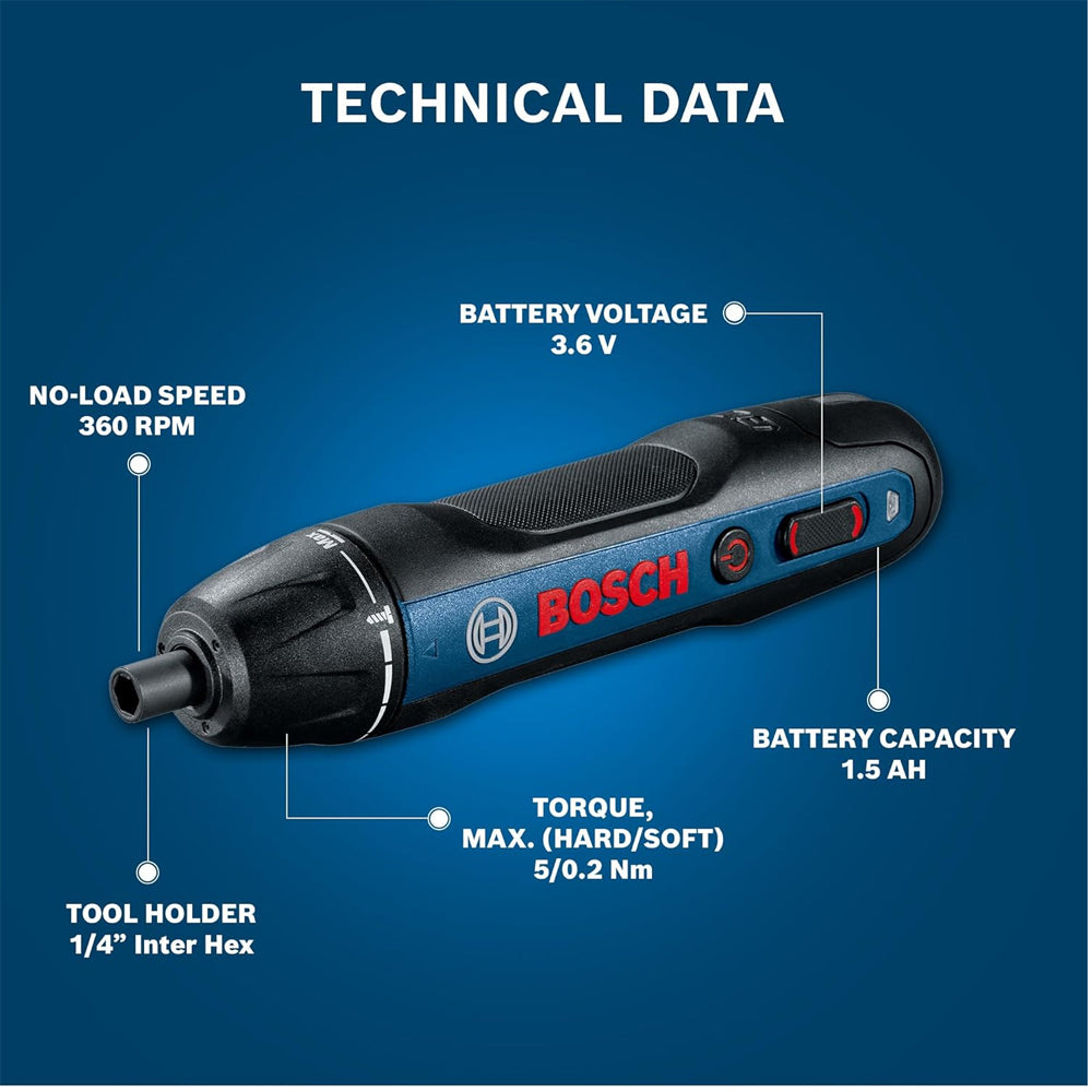 - Torque Selection & No-load Speed: The mechanical clutch features torque settings of 5 Nm (Hard) and 2.5 Nm (Soft), with five adjustable torque levels for versatility, plus a maximum performance mode. BOSCH GO 2.0 Screwdriver offers a no-load speed of 360 RPM catering to various tasks.