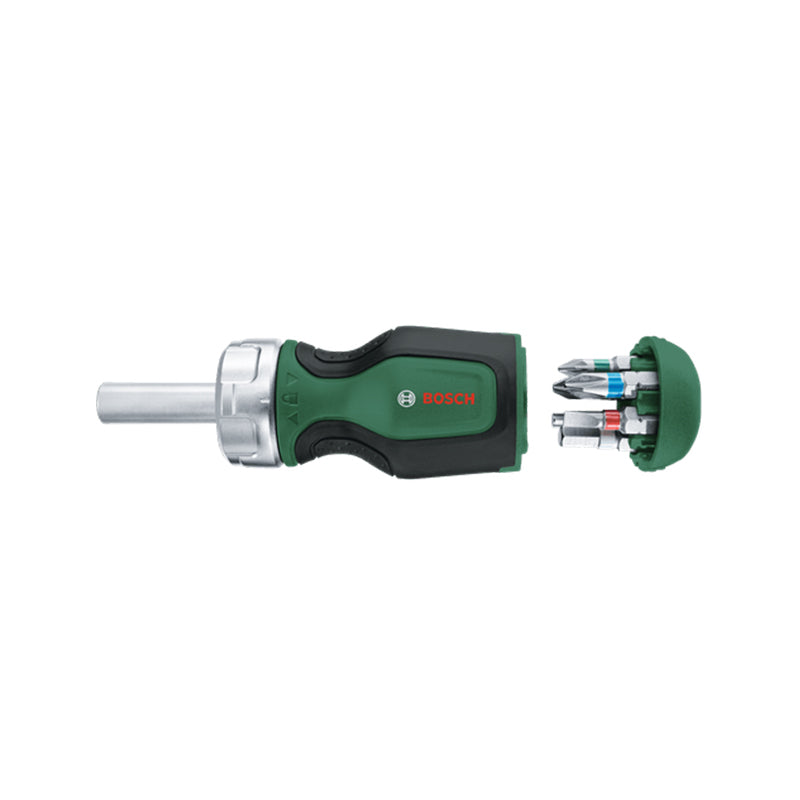 The Bosch Stubby Ratchet Screwdriver with 6 bits inside its handle is the comfortable and convenient all-rounder for fast and efficient DIY. Composed of a powder metallurgy gear with 36 teeth, the ratchet delivers an impressively high torque of up to 50 Nm. An intuitive metal ring enables fast directional change by twisting from left to right, and there’s a middle position for manual screwdriving. A strong magnetic holding force keeps bits in place, and the right bit is always at hand thanks to the 6-bit magazine with S2 hard-steel, colour-coded bits. This ratchet screwdriver is ergonomically made for comfort with a soft grip, two-component handle, and its compact size makes hard-to-reach screwdriving and precision tasks easy.
