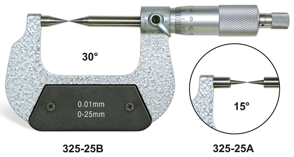 • Pointed spindle and anvil for measuring the web thickness of drills, small grooves, keyways.